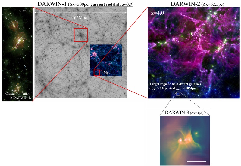 The DARWIN project will investigate the evolution and formation of dwarf galaxies using three-step simulations by zooming-in from cosmological scale to several environments with ~100pc resolution, and finally to single dwarf galaxies with <10pc resolution. To achieve this goal, it will use a heavily modified version of the RAMSES hydrodynamic code with the MPI+OMP+GPU parallelism and the next-generation supercomputer at Korea Insitute of Science and Technology Information.
